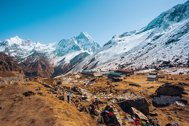 The day begins with a climb to Machhapuchhre base camp (3900 metres). To reach there we have to pass some glaciers, with care as one of them is a little dangerous. After Machhapuchhre base camp we have to walk across rocky moraine for around two hours to reach Annapurna Base Camp.